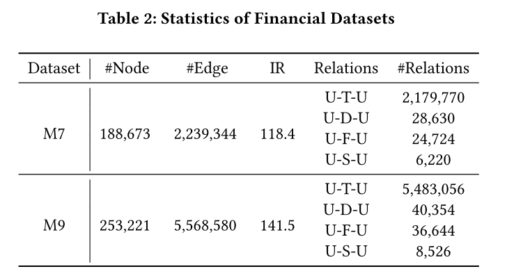 - 数据集:作者使用了两个公开的评论欺诈检测数据集(YelpChi 和 Amazon)以及两个来自阿里巴巴的实际金融欺诈检测数据集(M7 和 M9)。