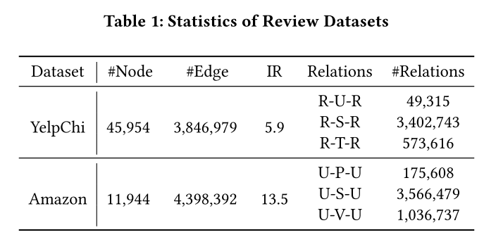 YelpChi 和 Amazon 数据集用于评论欺诈检测任务。